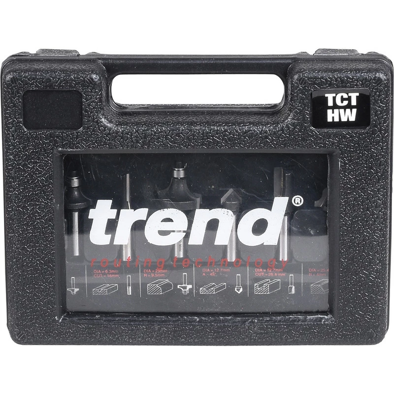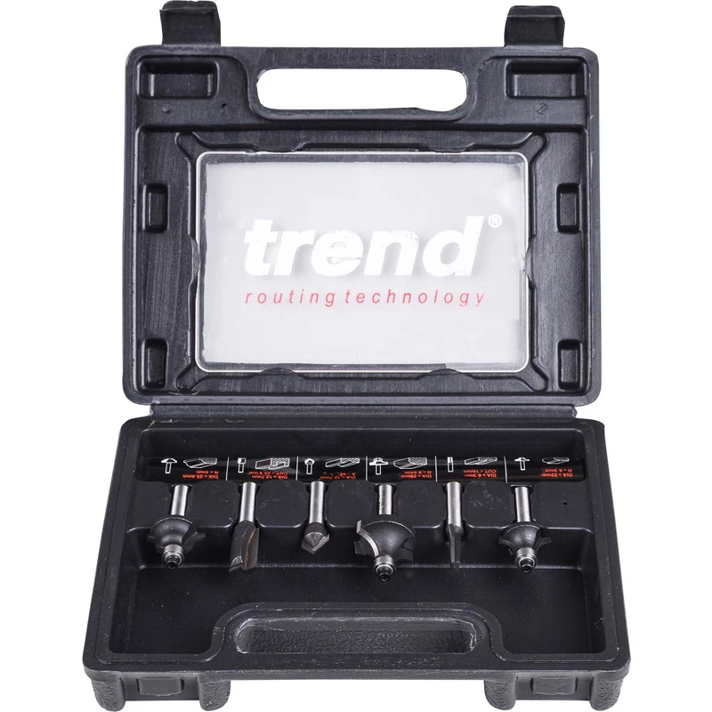 • 1x fraise droite Ø6.3 x 16mm, 1x fraise droite Ø12.7 x 25mm, 1 x fraise à rainurer en V Ø12.7, 1x fraise à arrondir rayon 6.35mm, 1x fraise à arrondir rayon 9.5mm, 1 x fraise à arrondir rayon 4mm